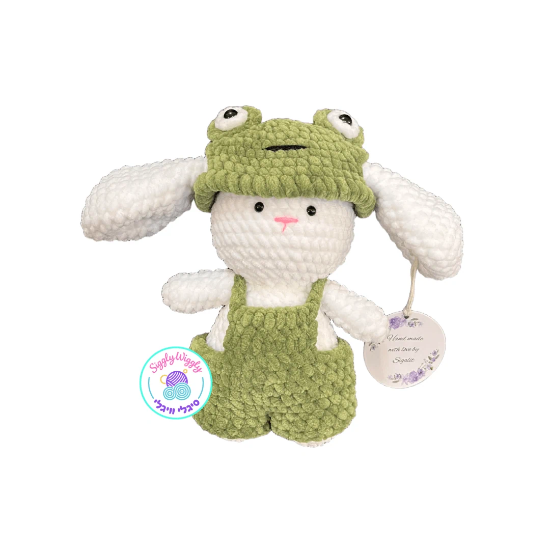 ארנבון סרוג בלבן רך עם אוברול ירוק וכובע צפרדע שמוסיף אופי ושובבות.
