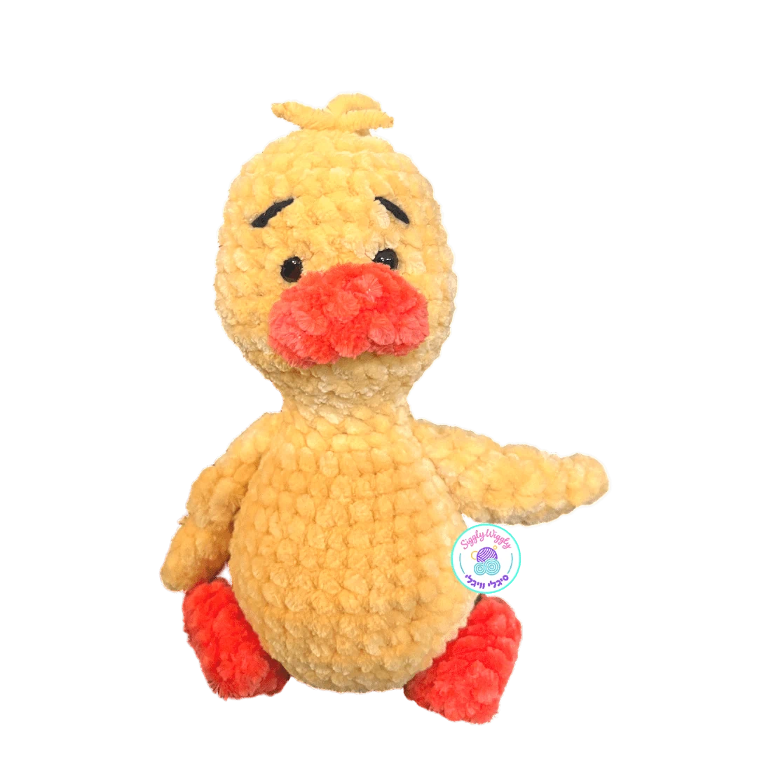 ברווז סרוג בעבודת יד בצהוב חמאה, עם מקור וכפות רגליים כתומות שמעניקות לו אופי שובב ומיוחד. ציצית קטנה על הראש ומבט רציני-מתוק שמיד גונב את הלב. הגוף העגלגל והרך הופך אותו לחבר מושלם לחיבוק.
