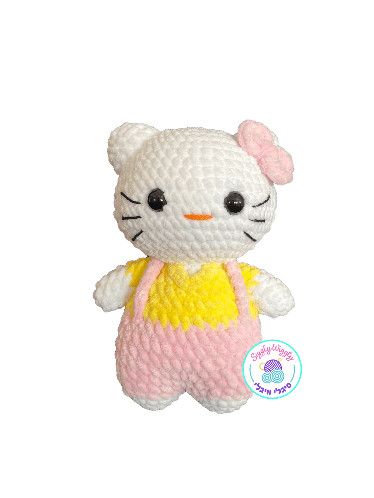 חתולי - חתולה הסרוגה בעבודת יד עם פפיון ורוד מתוק וחליפת אוברול בורוד וצהוב עליז.