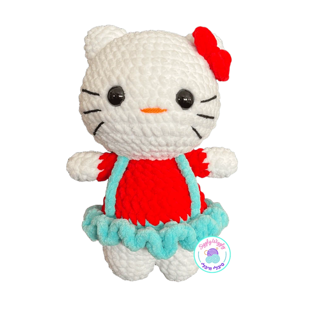 חתולה לבנה וסרוגה בעבודת יד עם פפיון אדום וחצאית טורקיז מתנפנפת שמעניקה לה אופי חגיגי ומלא חיים. השילוב המגניב של אדום וטורקיז הופך אותה לבובה שתופסת את העין ולא משחררת. קשה לעמוד בפניה.